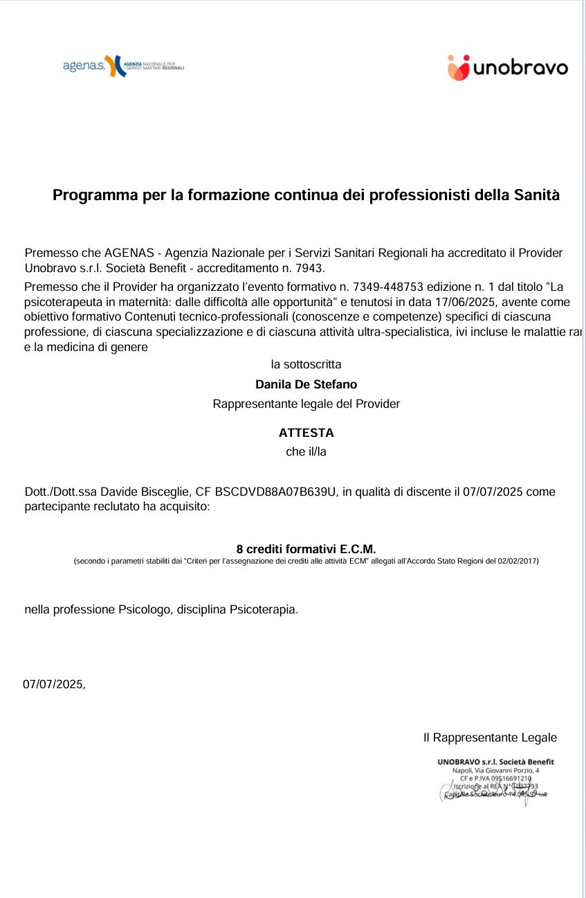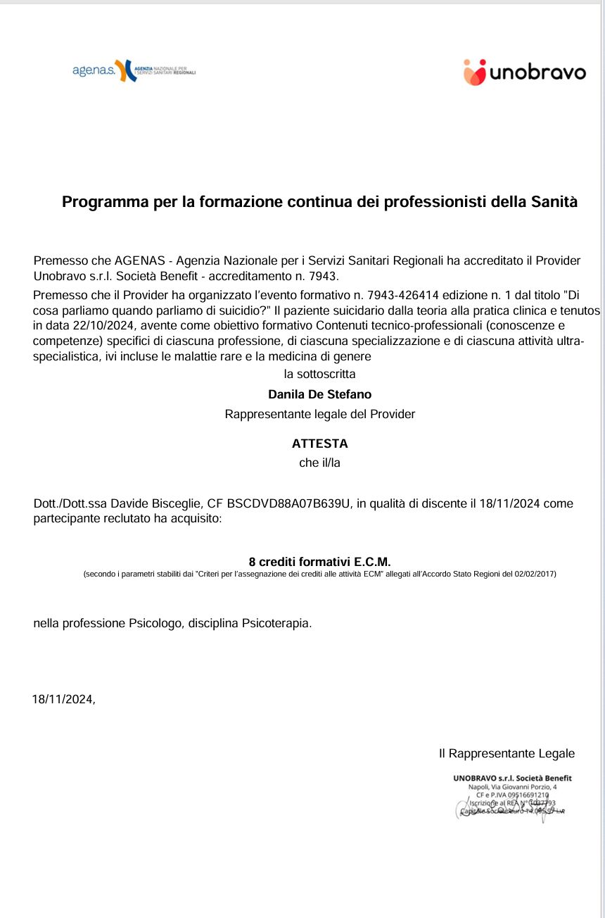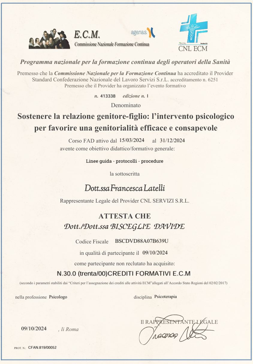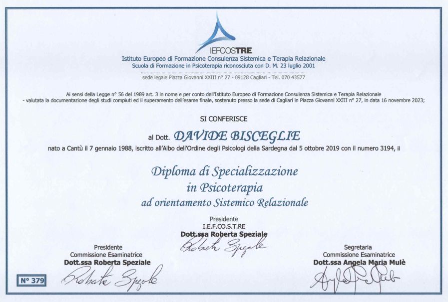 Sono un professionista della salute mentale, specializzato in psicoterapia personale, di coppia e familiare. Accompagno le persone ad accrescere la propria consapevolezza su come funzioniamo, in un clima accogliente di ascolto empatico e competente. Si tratta di un percorso delicato e profondo, attraverso il quale è possibile prendersi cura delle ferite passate e presenti, favorendo la costruzione di risorse per affrontare in modo funzionale i progetti presenti e futuri.